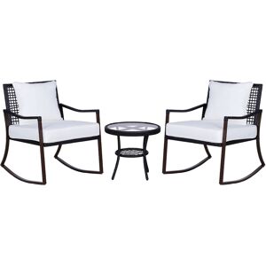 Rock the day away by yourself or with a friend with this three-piece set from Outsunny. Made from high quality PE wicker in a light grey finish, each piece is supported with a metal frame underneath for extra strength and stability. Each seat features two plush padded cushions and a high rise back for all day comfort. The set is completed with a matching side table which showcases a thick tempered glass top, ensuring it’s easy to clean whist adding a stylish finishing touch. Perfect for catching some well-deserved sun rays.Features:Three-piece outdoor set featuring two large armchairs and a matching side tableMade from UV and fade resistant PE rattan for strength and stabilitySteel frame underneath for enhanced support and strengthRocking design allows you to drift away peacefully at your own paceThick tempered glass on table for a stylish look that’s easy to clean and maintainBottom shelf on table for storageWashable cushions on seatsAssembly required